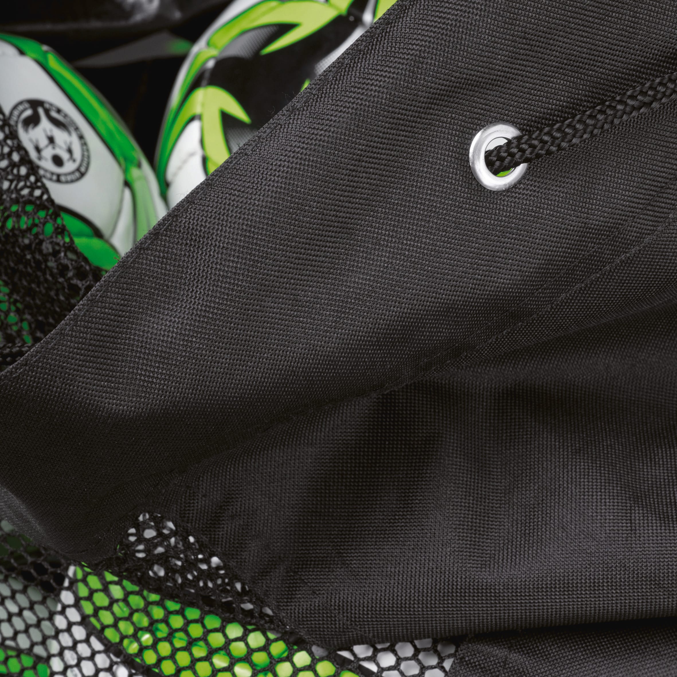 100% polyester with PVC backing. Mixed construction textured canvas for quick ball drying. Adjustable polypropylene shoulder strap and drawstring fastening at top of bag.