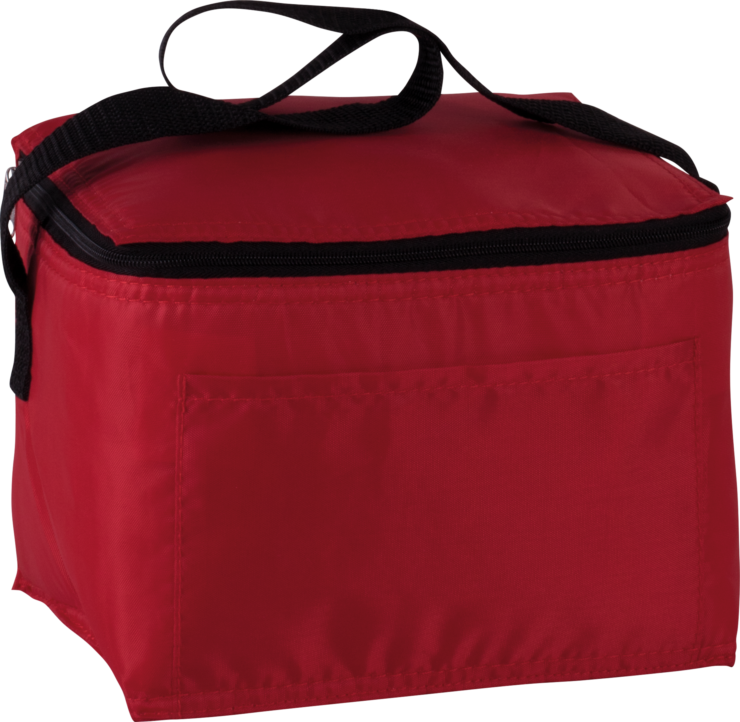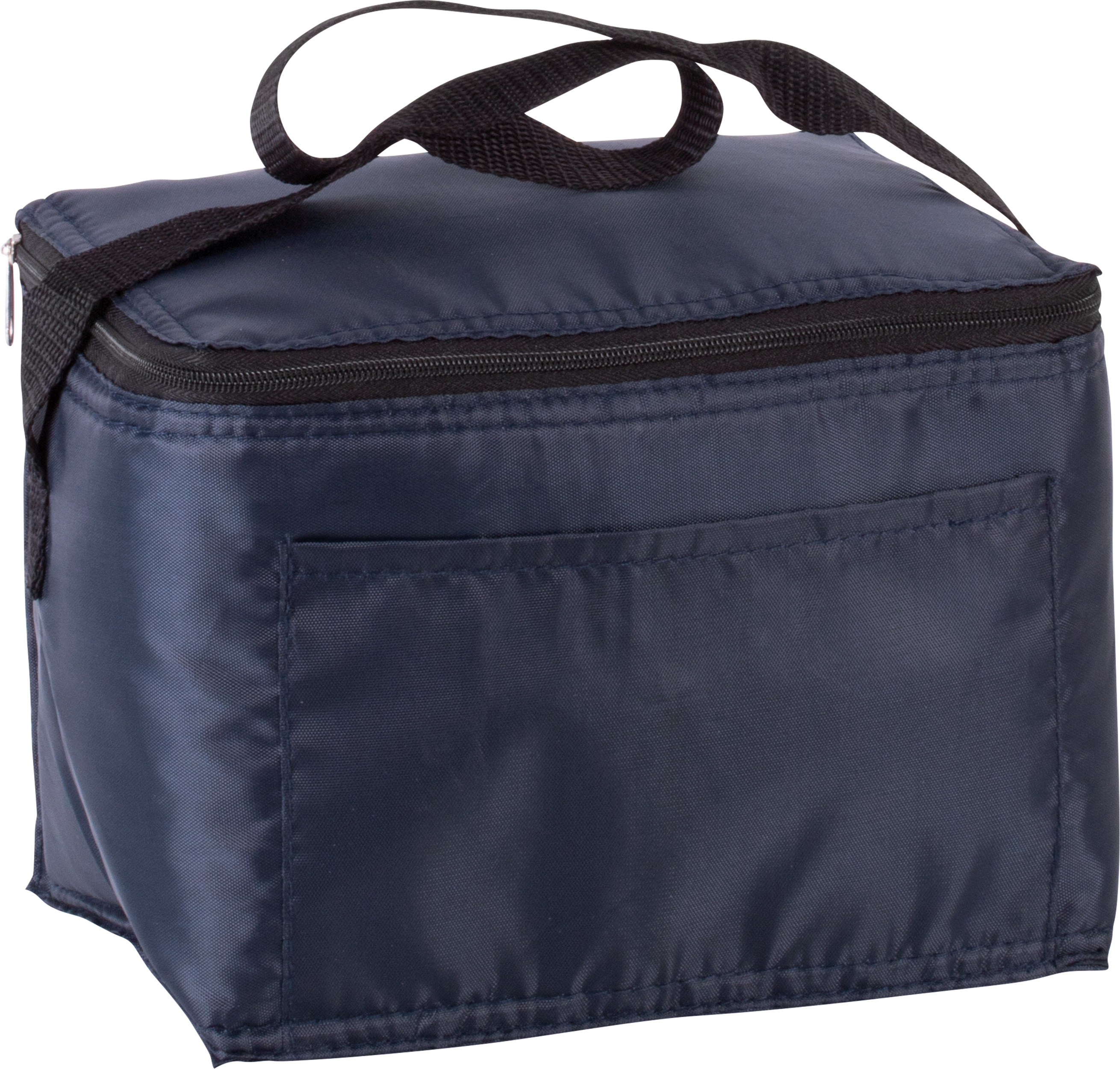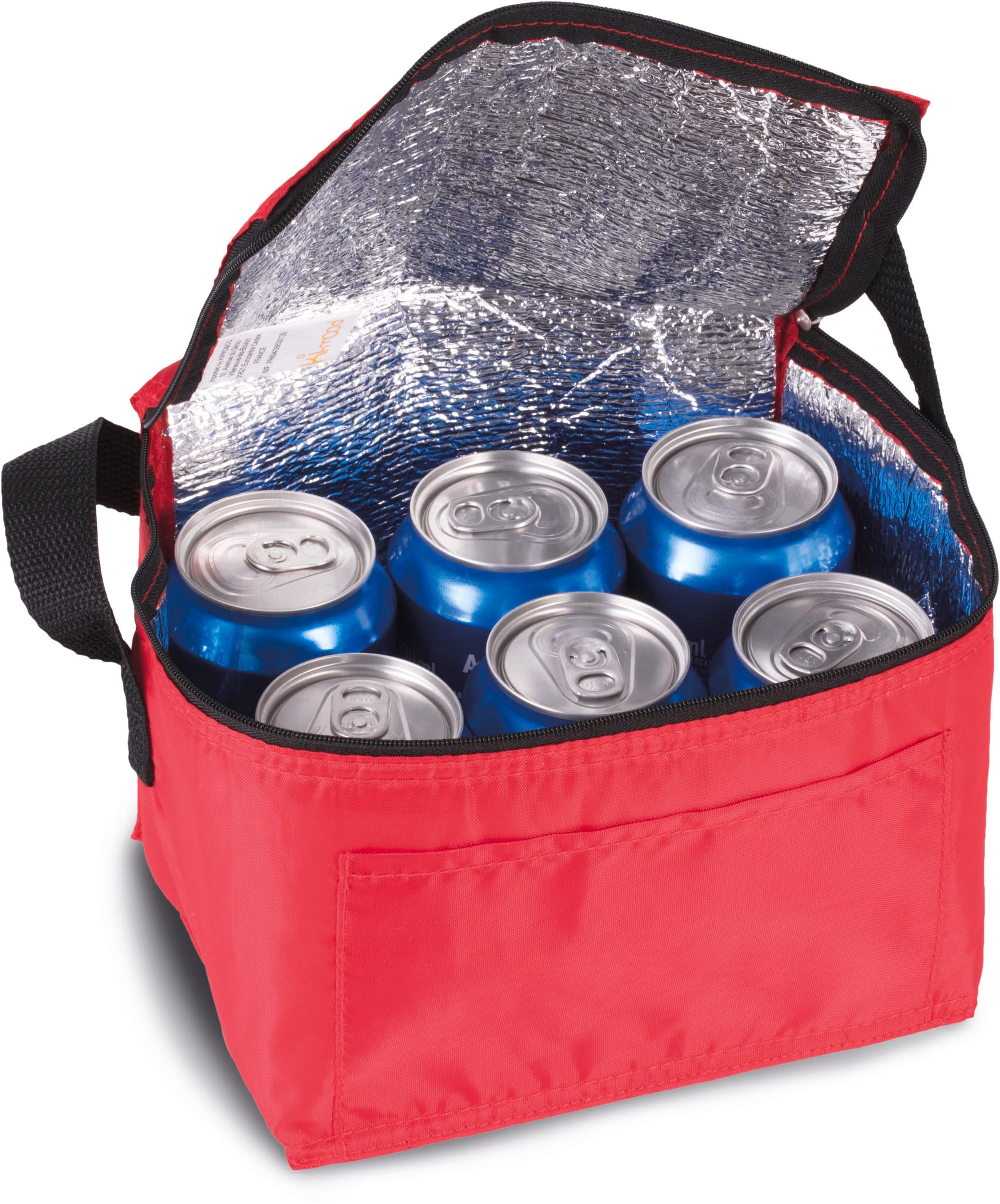 Cool bag in 210D polyester aluminium lining. Front pocket for easy decoration access. Can hold up to 6 cans.