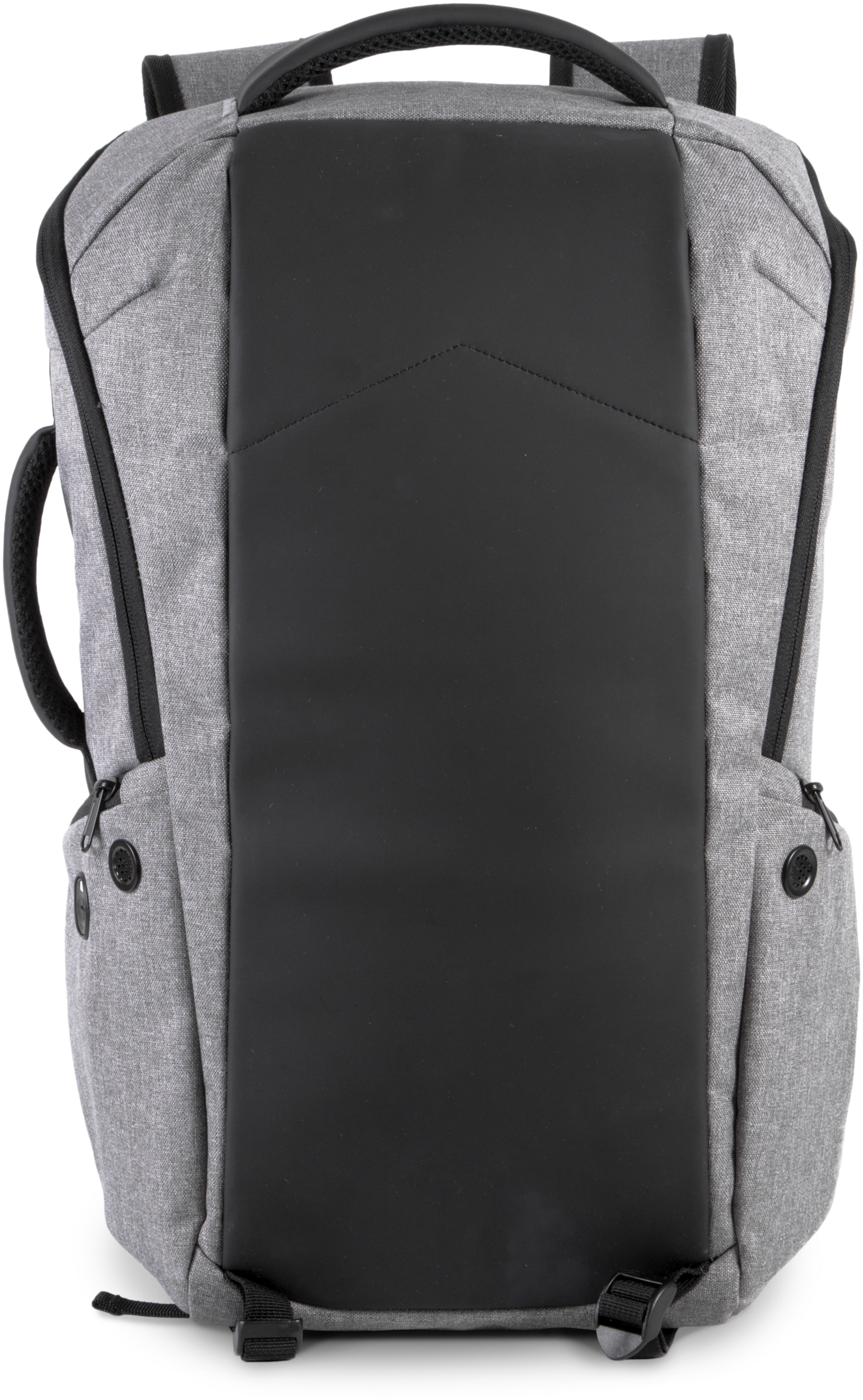 100% polyester. Of which 50% recycled polyester. 600D polyester anti-theft backpack. Reinforced cut-proof front panel. Back zip closure with TSA combination lock. Back-protected quick-access zipped pocket. Adjustable shoulder straps and sternum strap. 2 zipped pockets on the shoulder straps. 2 straps on bottom to hold jackets or sweaters. 2 side pockets. 1 side pocket with built-in USB port connected to inner power bank holder (inner micro USB cable provided). 1 side pocket with theft-preventing coiled cable to attach the backpack to table/chair leg. Inner compartment with padded laptop sleeve for laptops up to 15 inches. Padded tablet sleeve for tablets up to 11 inches. 2 mesh zipped pockets. 2 detachable zipped pouches for cables or accessories. 2 inner pockets, including 1 for bottles or flasks and 1 for storing a power bank. Integrated Rain Cover.