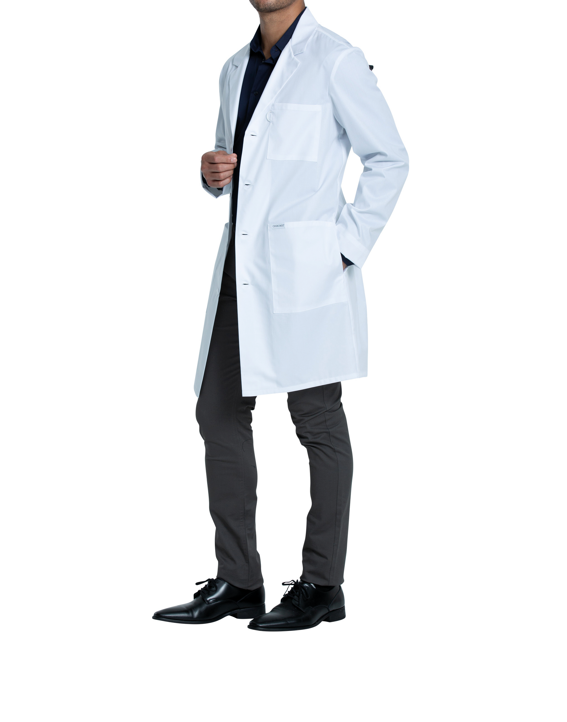 65% poliéster / 35% algodón. Tejido de sarga. Corte unisex. Tres bolsillos: bolsillo en el pecho, dos bolsillos delanteros para tablets. Aberturas de acceso laterales. Trabilla elástica para identificación.