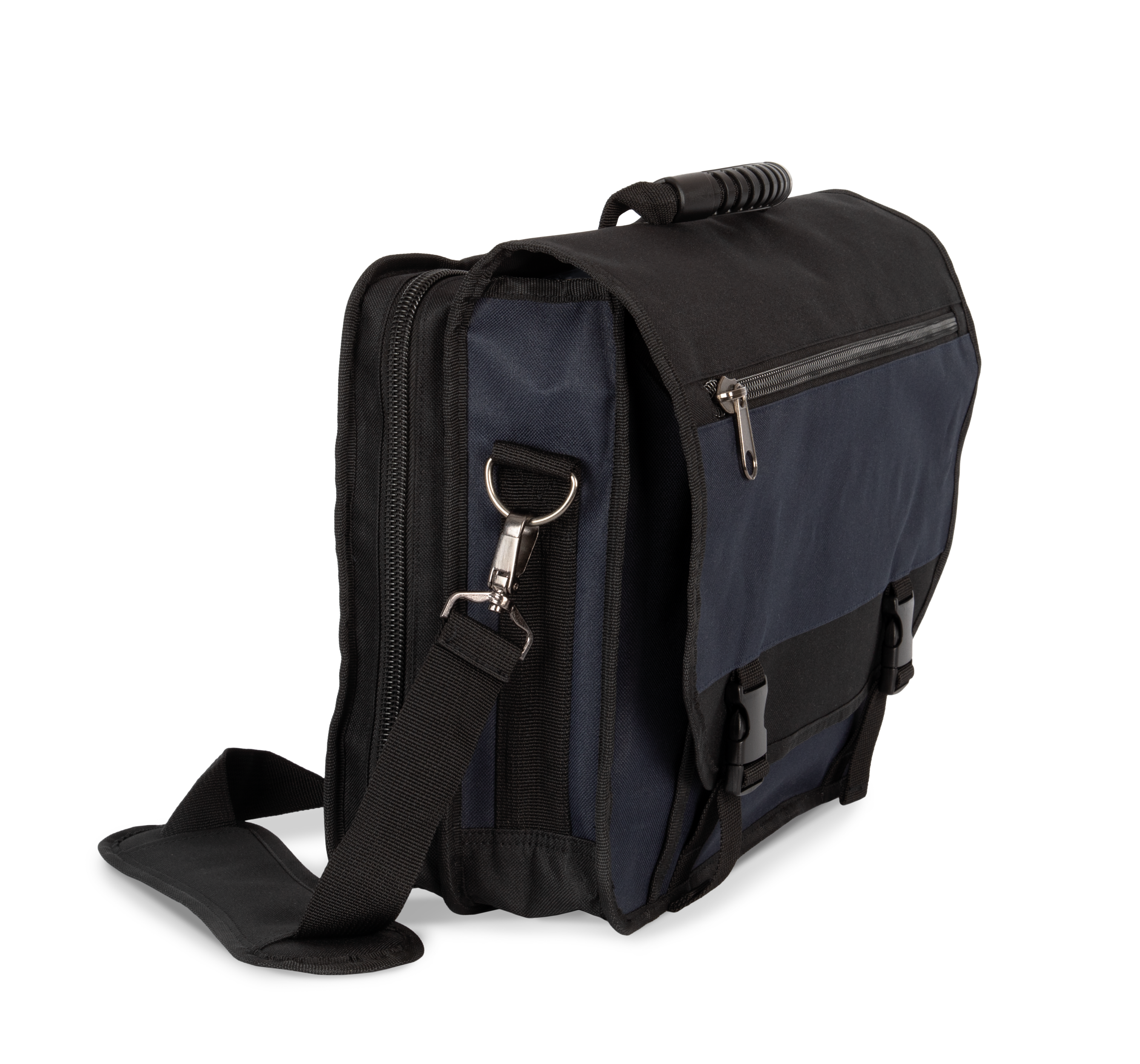100 % poliéster. Bolsa con bandolera ajustable. Compartimento portaherramientas organizado con posiciones para distintas herramientas. Solapa con bolsillo delantero para una personalización fácil. Gran compartimento principal para guardar documentos y un ordenador de hasta 15 pulgadas. La bolsa está reforzada para soportar el peso de un contenido adaptado.