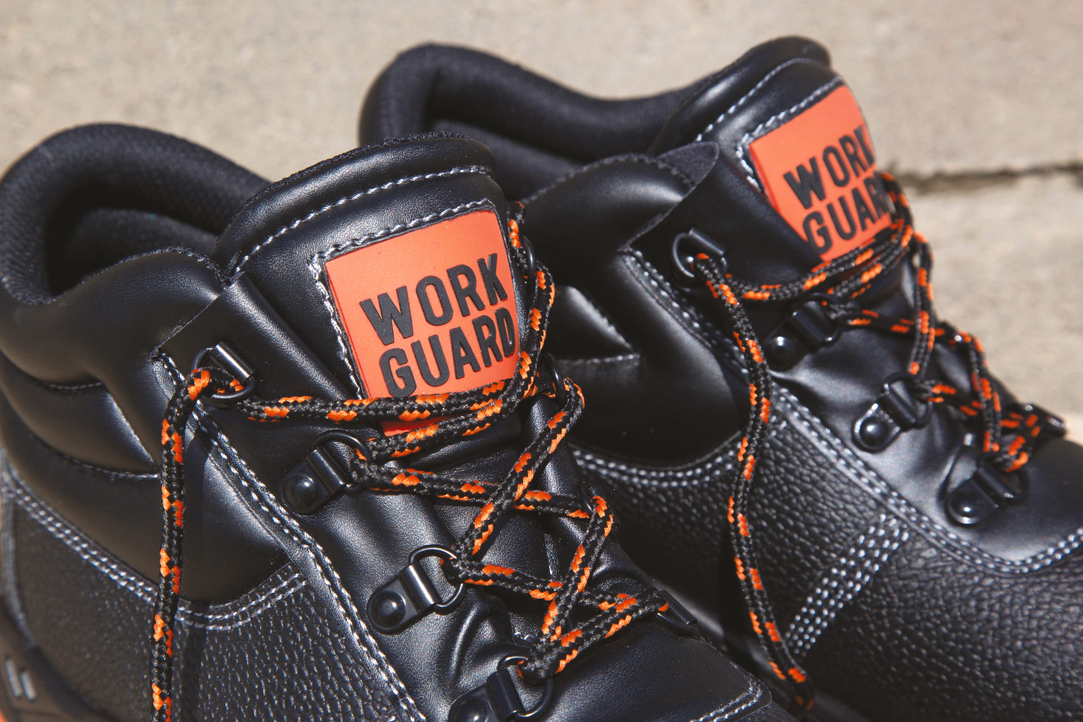 Chaussure montante à tige en croûte de cuir estampée noir résistant à l'eau. Doublée maille filet noire et rembourrée à hauteur de la malléole. Œillets noirs brillants et 3 jeux de lacets fournis (Orange, Black et Orange/Black). Semelle PU double densité résistante à l'huile, embout en acier et semelle intercalaire en acier. Collier et languette rembourrée. Talons absorbeurs de chocs. EN 20345:2011 S1P SRA.