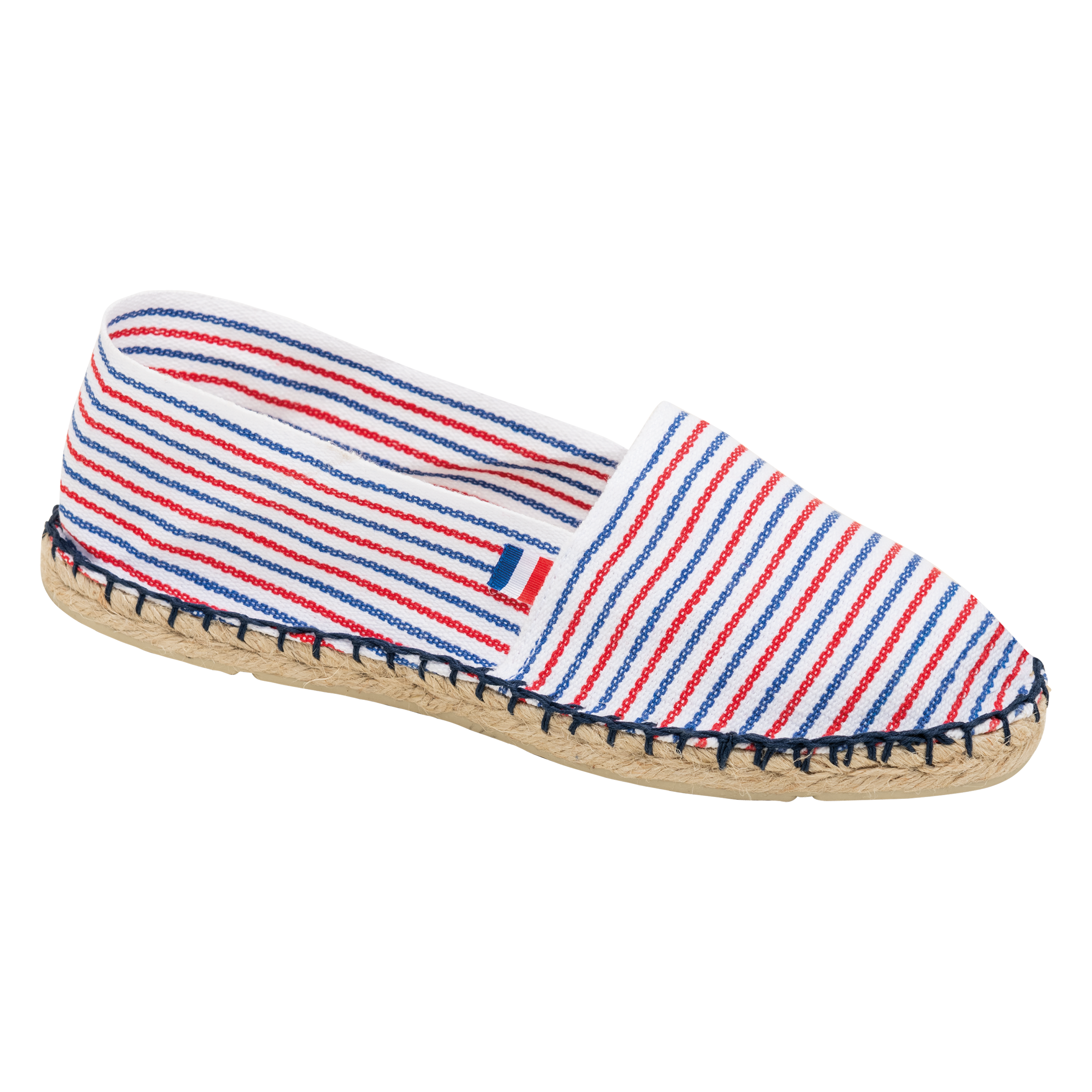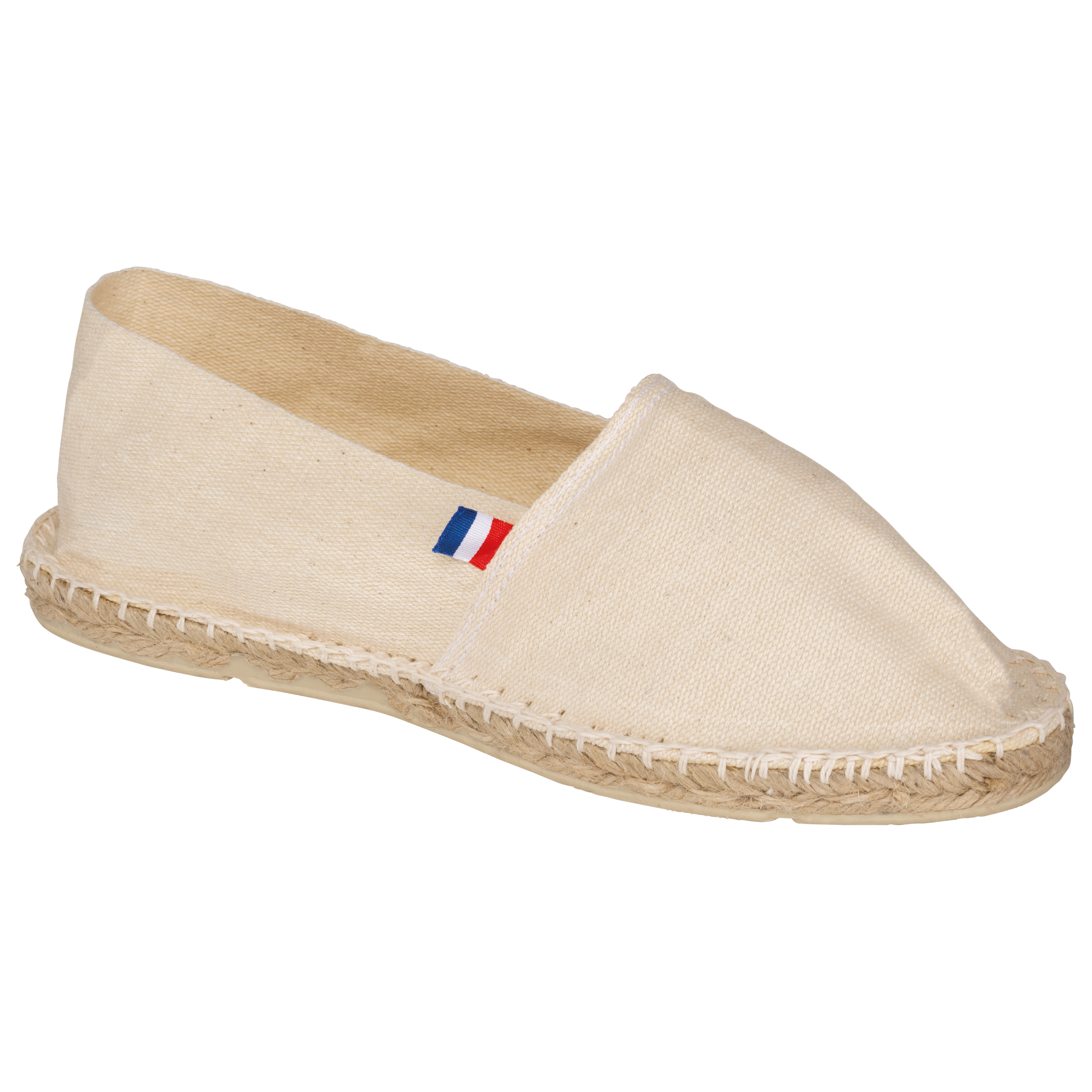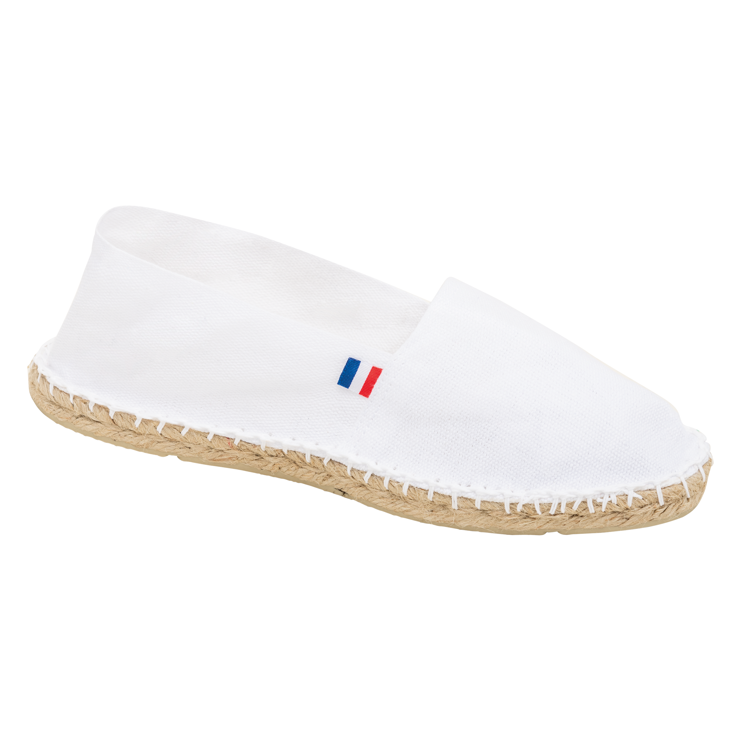 Tela 100% cotone. Suole in gomma vulcanizzata e iuta. Produzione francese.